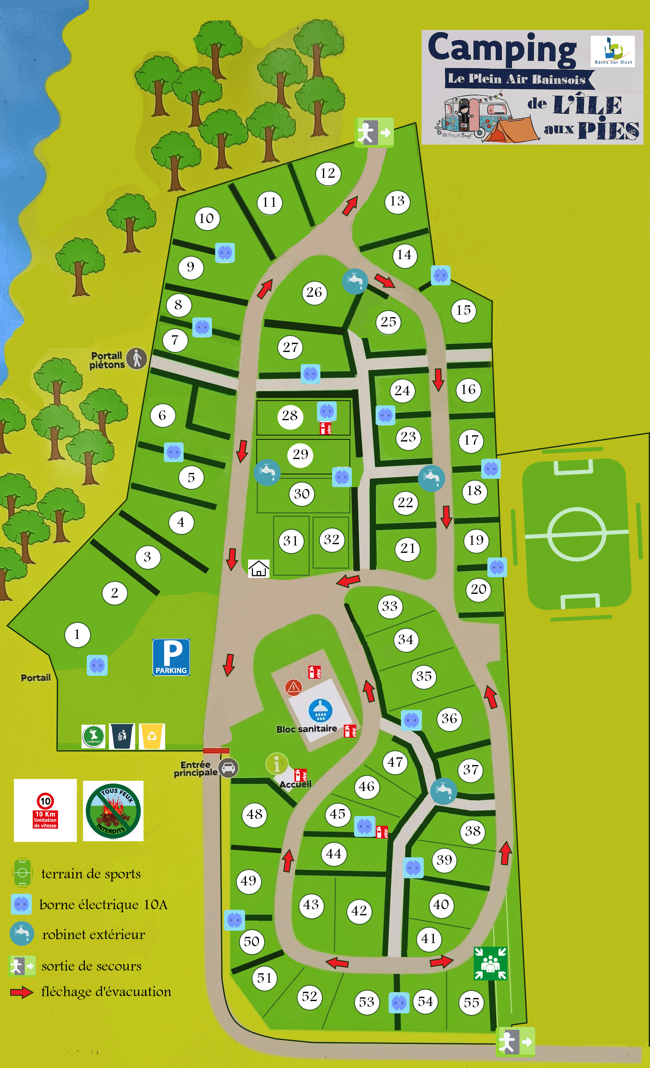 Le Camping de l’île aux pies vous propose une large gamme d’hébergements ainsi que des emplacements dont certains disposent d’une borne électrique (10A). Le camping comprend 44 emplacements, 4 cabanes étape colorées en bois, 2 Dili-tentes perchées et 1 Dili-tente pique nique avec vue sur le canal et 4 Vacancials (mobile-homes sans sanitaire).